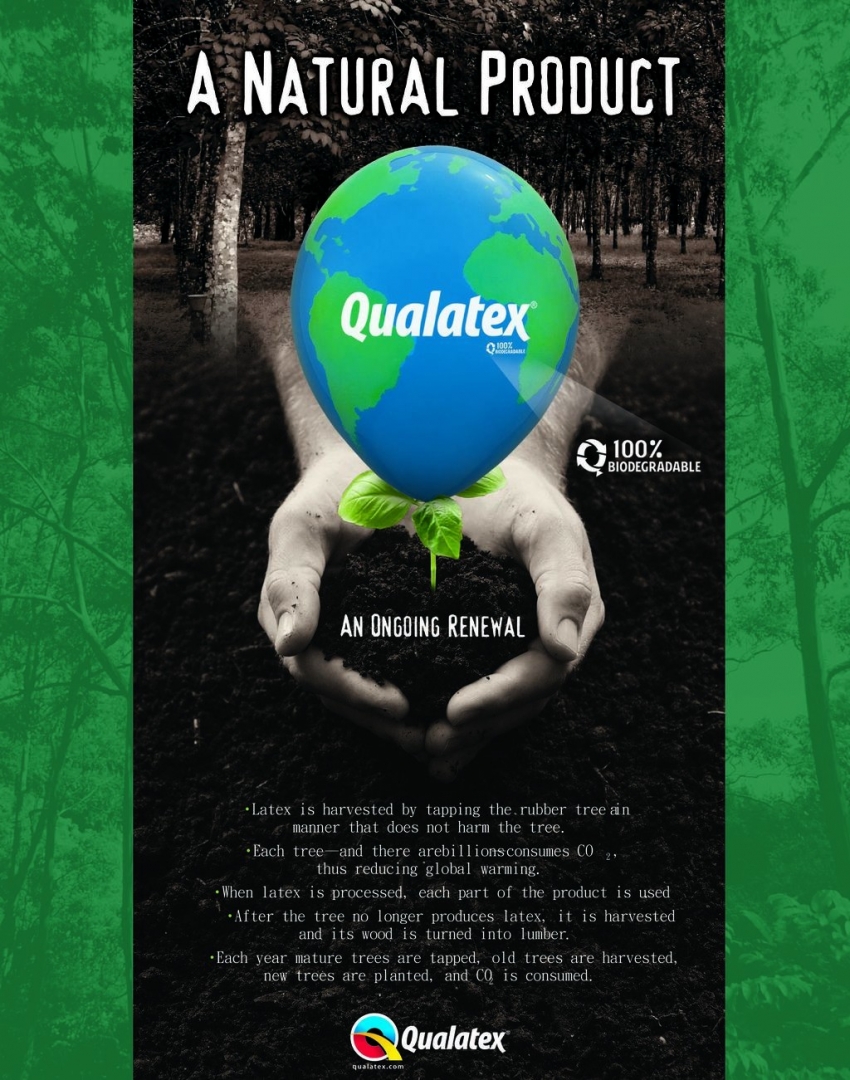 A legkiválóbbnak minősített Qualatex léggömböket az Amerikai Egyesült Államokban és Kanadában gyártják 100%-ban természetes, biológiailag lebomló latexből, hozzáadott műanyag nélkül. Az alapanyagot ellenőrzött kaucsukfa ültetvényekről szerzik be, melyeket egy nemzetközi nonprofit szervezet, az Esőerdők Szövetsége (Rainforest Alliance) felügyel.
